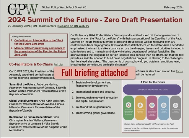 This Global Policy Watch Factsheet #5 on the Zero Draft of the Pact for the Future walks through a summary of the co-facilitators’ presentation on how they approached the Zero Draft, Member State reactions and useful links including to the Zero Draft and negotiations timetable. The previous GPW Factsheet #4 on SotF also provides valuable information on the process.