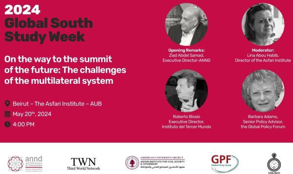 As part of the 2024 Global South Study Week on Sustainable Human Development, Arab NGO Network for Development (ANND), Third World Network (TWN), The Asfari Institute for Civil Society and Citizenship, Global Policy Forum and Social Watch invite you to a special session: “On the Way to the Summit of the Future: The Challenges of the Multilateral System.”