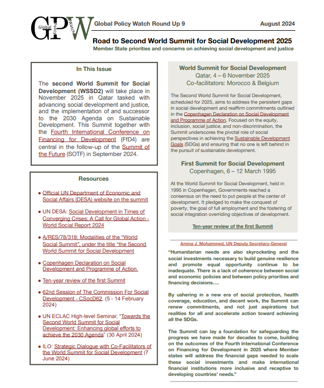 The second World Summit for Social Development (WSSD2) will take place in November 2025 in Qatar tasked with advancing social development and justice, and the implementation of and successor to the 2030 Agenda on Sustainable Development. This Summit together with the Fourth International Conference on Financing for Development (FfD4) are central in the follow-up of the Summit of the Future (SOTF) in September 2024.