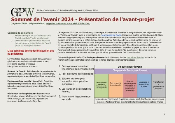 Cette fiche d'information n°5 de Global Policy Watch sur l'avant-projet du Pacte pour l'avenir présente un résumé de la présentation des co-facilitateurs sur la façon dont ils ont abordé l'avant-projet, les réactions des États membres et des liens utiles, y compris vers l'avant-projet et le calendrier des négociations. La précédente fiche d'information GPW n°3 sur le Sommet fournit également des informations précieuses sur le processus.
