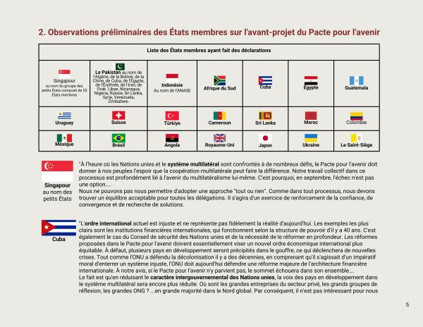 Les États membres des Nations unies ont entamé des négociations sur le document final du Sommet de l'avenir : le Pacte pour l'avenir. Le processus a débuté le 29 janvier 2024 avec la présentation par les co-facilitateurs de l'avant-projet du Pacte et les réactions des États membres.