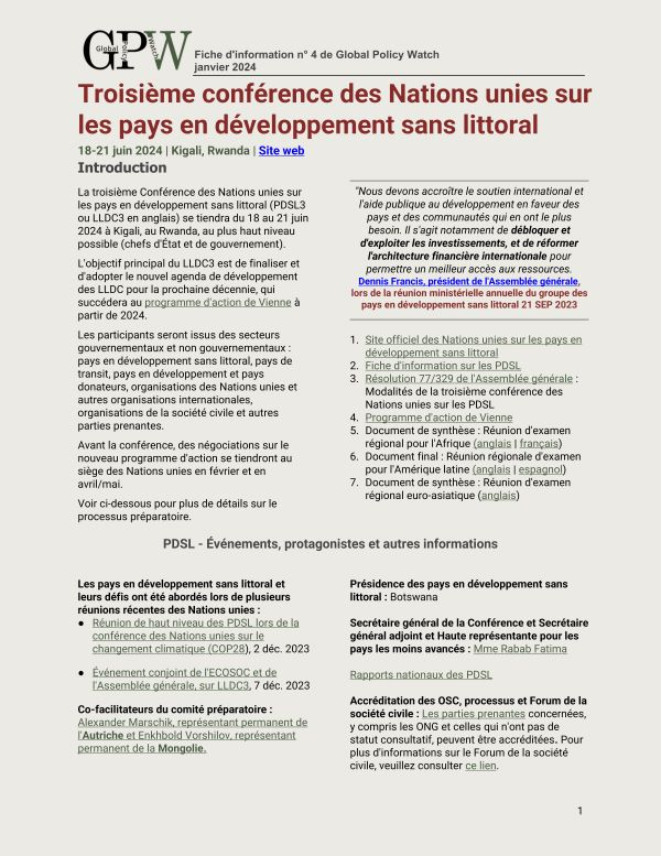 La troisième Conférence des Nations unies sur les pays en développement sans littoral (PDSL3 ou LLDC3 en anglais) se tiendra du 18 au 21 juin 2024 à Kigali, au Rwanda, au plus haut niveau possible...