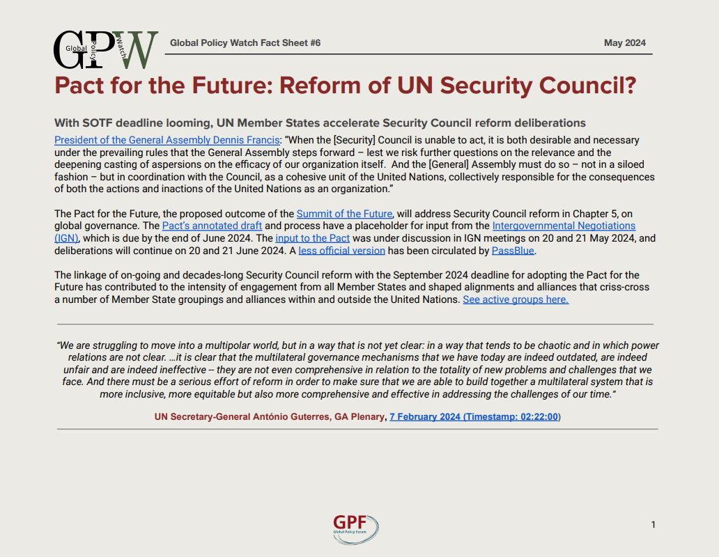 The Pact for the Future, the proposed outcome of the Summit of the Future, will address Security Council reform in Chapter 5, on global governance. The Pact’s draft and process have a placeholder for input...